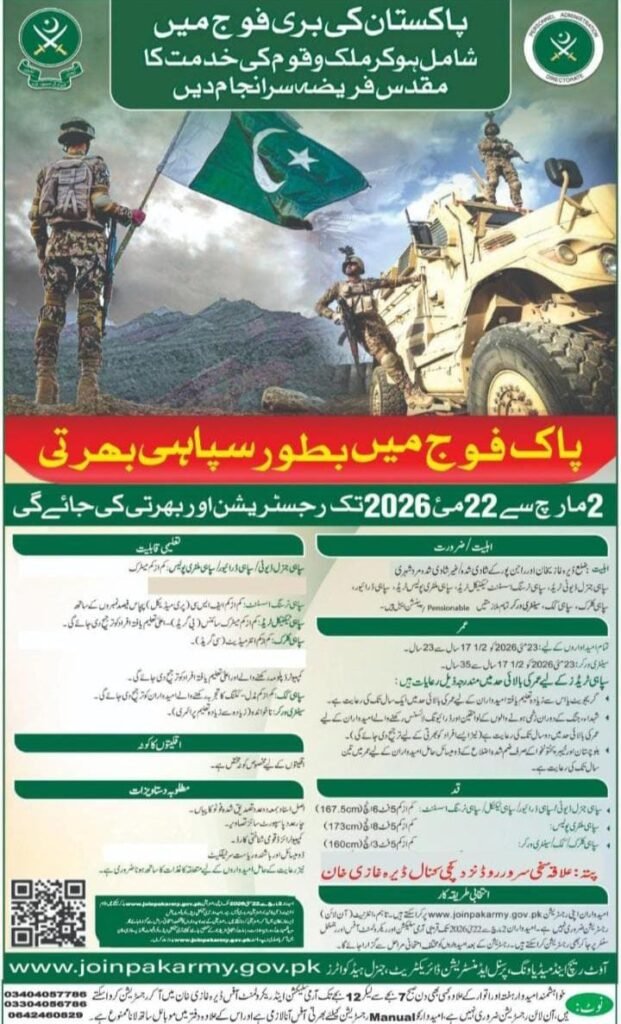 Join Pak Army Jobs 2026 – Check eligibility, salary, selection process, and online registration details. Apply for soldier, officer, and DSSC entries today.